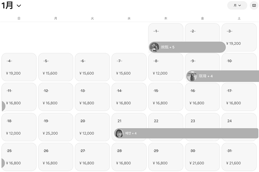 ※日付に線が入っている箇所は一部ブッキングドットコムからの予約になります。