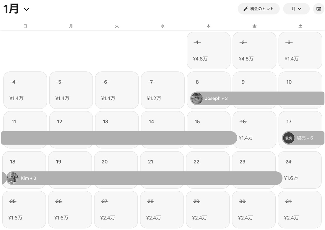 ※日付に線が入っている箇所は一部ブッキングドットコムからの予約になります。